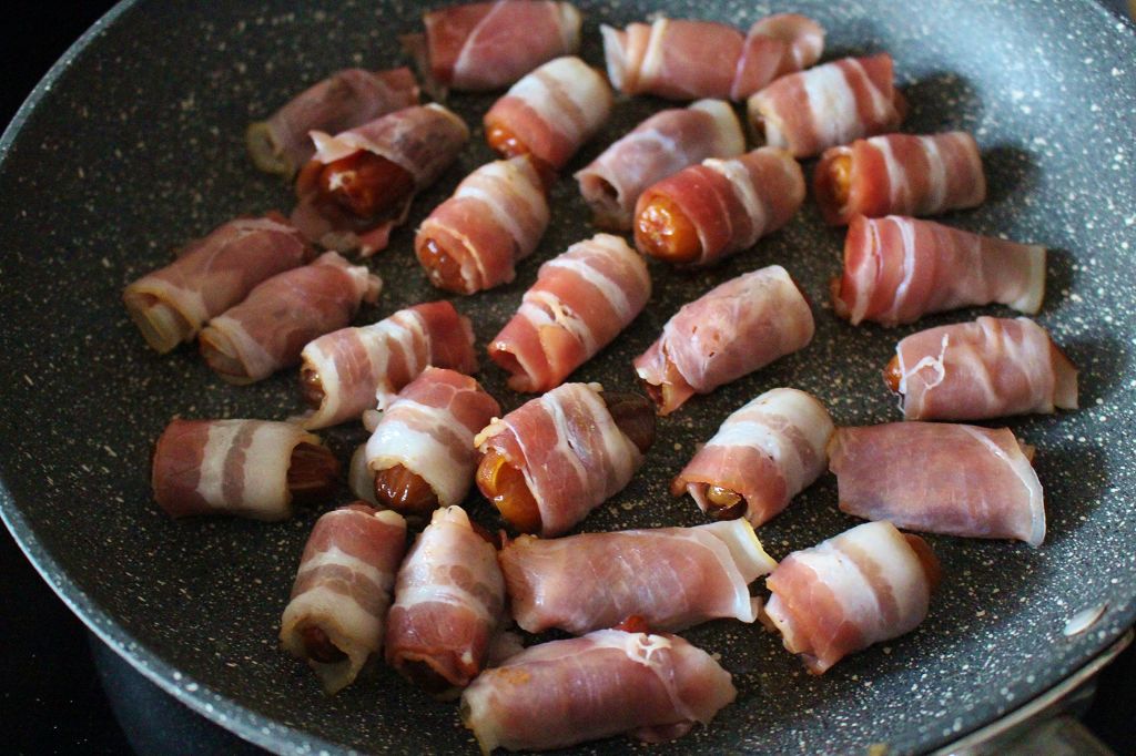 2.) In einer Pfanne bei mittelhoher Hitze die gerollten Datteln von allen Seiten braten, bis der Speck hellbraune stellen bekommt und knusprig wird. Bei Speck braucht ihr kein Öl, bei Tofu schon ein wenig. Lasst beim Tofu auch die Zahnstocher drin. Direkt servieren, zum Beispiel mit Zahnstocher drin,
