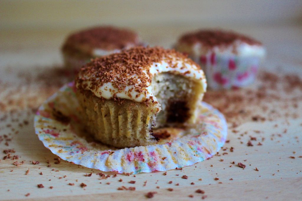 2.)Die Creme mit einem Löffel auf die Muffins verteilen und mit einer Raspel Schokoladenschnee darüber geben. Fertig!