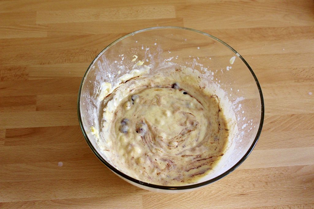 2.) In einer zweiten Schüssel Mehl und Backpulver gut mischen und zu den Eiern geben. Die Butter mit dem Mixer einrühren, die Bananen in kleinen Stücken dazu geben und unterrühren, dannMilch hinzugeben und die Schokodrops einrühren.