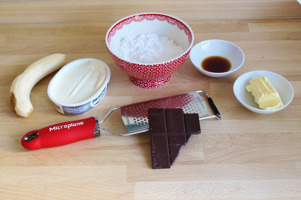 1.) Die Butter auf höchster Stufe mit dem Hand Rührer fluffig schlagen dann den Puderzucker darüber sieben und nochmal gut rühren, dann die Banane in kleinen Stücken sowie die Vanille dazu geben und nochmal mit dem Mixer rühren, bevor man den Frischkäse dazu gibt. Kurz rühren bis sich alles verbunden hat und .