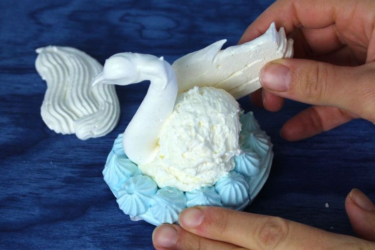 5.) Die Baisers im vorgeheizten Backofen bei 100°C für 35 bis 40 Minuten backen. Öffnet nach 35 Minuten kurz den Ofen und versucht, sie anzuheben. Wenn sie sich rückstandslos vom Papier lösen, sind sie fertig. Sonst gebt ihr ihnen noch ein paar Minuten. Gebt einen Klecks Creme (z.B. Schlagsahne) auf die blauen Teich-Fladen und klebt die Flügel links und rechts davon auf und steckt den Schwanen-Kopf hinein. Fertig.