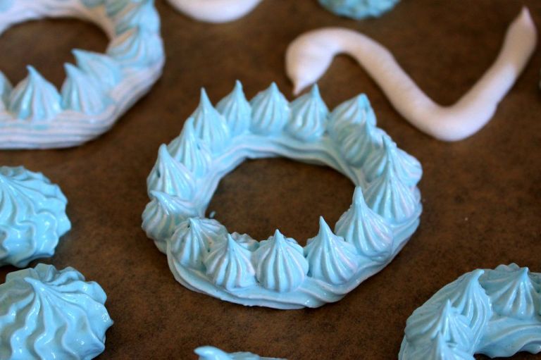 4.) Mit dem blauen Baiser für jeden Schwan einen runden Teich spritzen. Aus dem Rest kleine blaue Tupfer mit Loch- oder Sterntülle spritzen.