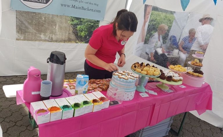 Passend in pinkem „MainBacken-Shirt“ am Stand 🙂