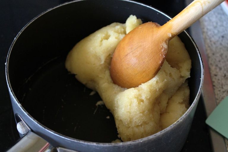 1.) Die Butter mit dem Wasser in einem Topf bei mittlerer Hitze schmelzen. Salz und Mehl in einer Portion dazu geben und mit einem Holzlöffel gut verrühren. Die Masse dickt sehr schnell an und sollte unter ständigem Rühren mit dem Löffel im Topf geknetet werden, bis sich auf dem Boden des Topfes ein weißer Rand bildet. Das dauerte bei mir so etwa 3 Minuten.