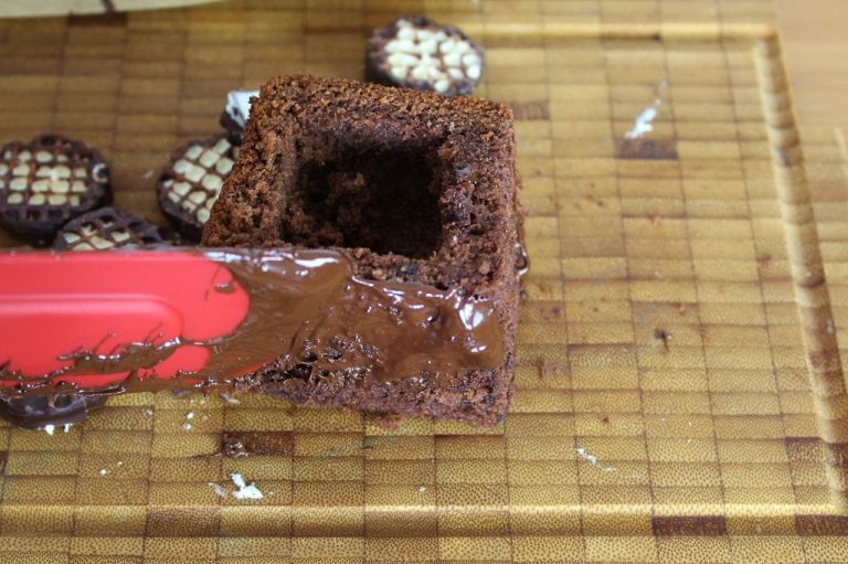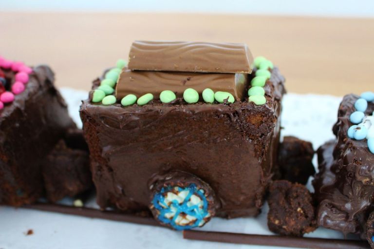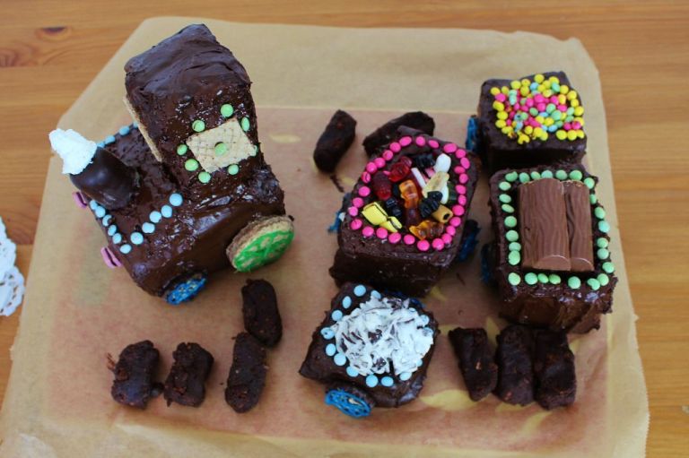 Tipp: Übrige Schokolade mit Kuchenkrümeln und ggf. weiteren Resten zermanschen und kleine rechteckige Stücke formen, die man als Verbindungsstück zwischen den Wagons nutzen kann.