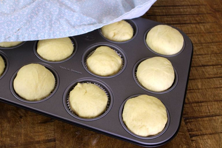 3.) Ein Muffinblech mit Papierförmchen auslegen. Den Hefeteig, der sich nach der 2. Gehzeit im Volumen deutlich vergrößert hat, mit der Hand kurz durchkneten und in zwölf Kugeln in die Förmchen verteilen. Erneut abgedeckt für ca. 30 Minuten an einem warmen Ort gehen lassen. (3. und letzte Gehzeit).