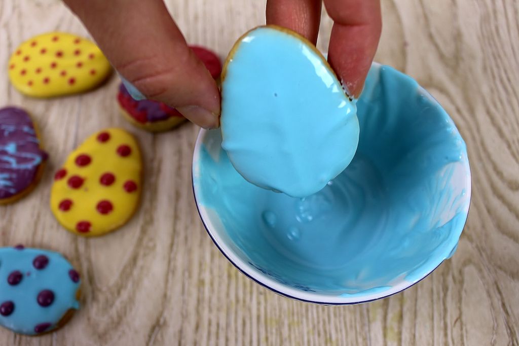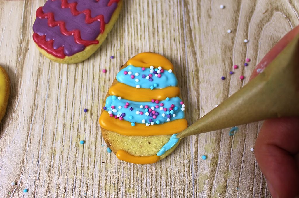 5.) Die Kekse im unteren Drittel im Backofen für 8-10 Minuten backen, bis sie schön golden sind. Vollständig auskühlen lassen und dann die passenden Keks-Paare zusammen legen – es muss pro Doppelkeks nur eine Seite dekoriert werden, die andere bleibt blank. Dafür die Schokolade im Wasserbad schmelzen und mit einem Löffel oder auch einer Spritztülle auftragen und vollständig erhärten lassen. Bei Bedarf die feuchte Schokolade mit Streuseln dekorieren.