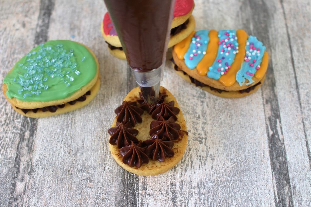 Tipp: Man kann die Kekse auch vor dem Dekorieren mit der Creme füllen, das geht problemlos – ich finde es so rum aber einfacher. Für Ideen, wie man die Kekse dekorieren kann (übrigens auch nur mit heller und dunkler Schokolade) schaut euch die Foto-Beschreibungen an.
