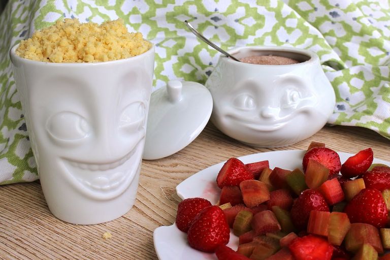 Übrigens – ich war neulich mit ein paar Freundinnen auf einem Afterwork-Drink in einer schönen Café-Bar in Frankfurt und nach einem köstlichen Essen wollten wir uns das Tages-Dessert bestellen: Erdbeer-Rhabarber Crumble. Gemeint war allerdings kein Crumble, sondern eine Mascarpone-Schicht-Dessert. Crumble (zu Deutsch „Streusel“) waren nicht drauf, deshalb weiß ich nicht, wie dieser Name zustande kam. Naja, jedenfalls hatte ich seitdem unfassbar Lust auf ein richtiges Crumble! Und das gibt es jetzt!