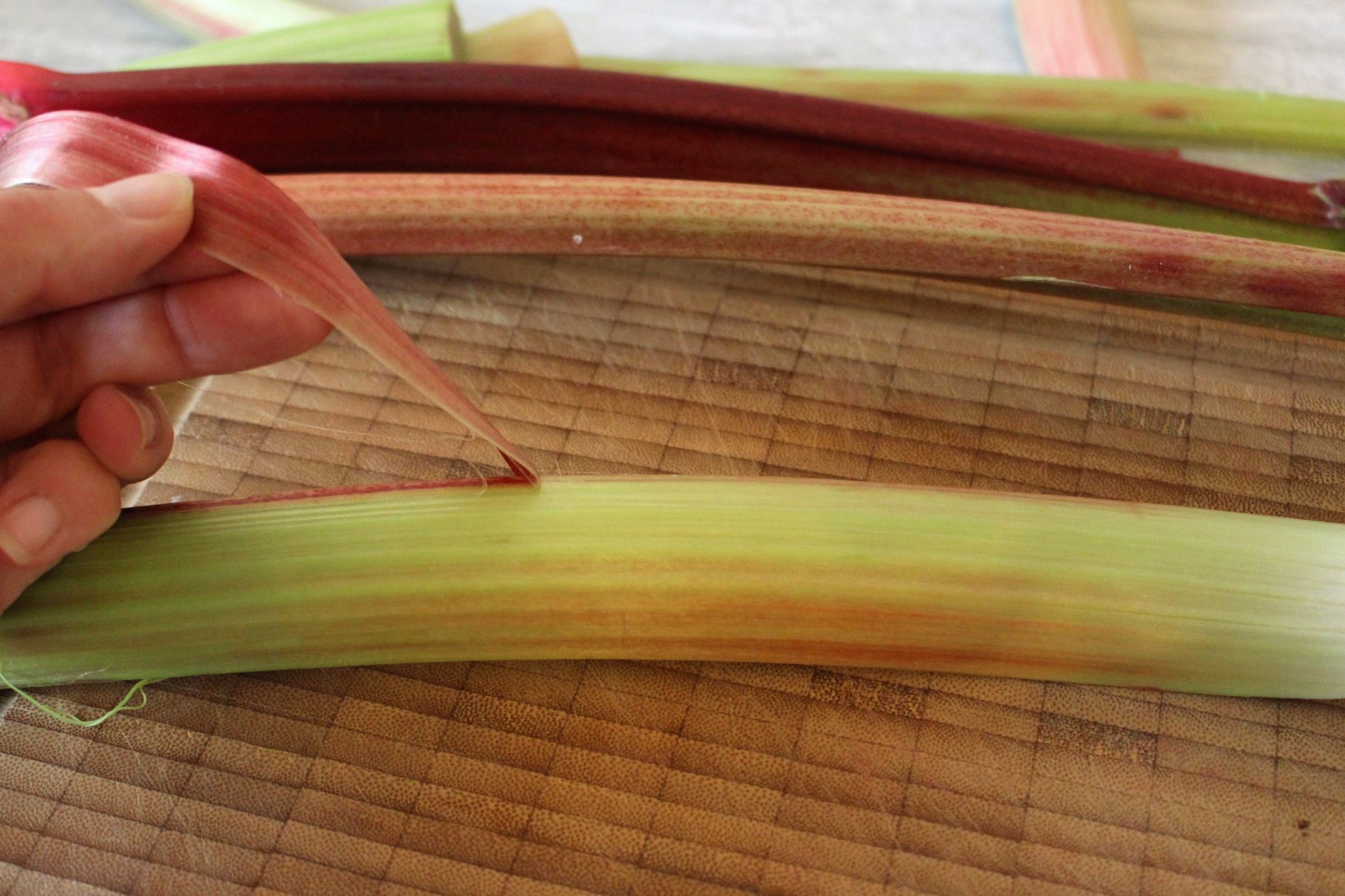 Rhabarber richtig schälen: Einfach die äußerste Schale (eher Haut) abziehen. Sie ist bitter und nicht gut verträglich.