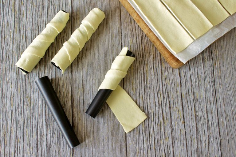 1.) Den Backofen auf 170°C vorheizen. Den Blätterteig in acht Streifen schneiden und je einen um eine Schaumrolle wickeln. Ein Eigelb mit Milch zerkleppern und den Teig bepinseln. Mit schwarzem Sesam bestreuen und für ca. 10 Minuten im Backofen backen.