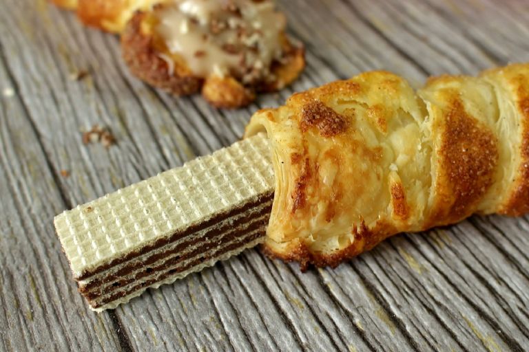 1.) Den Backofen auf 170°C vorheizen. Den Blätterteig in acht Streifen schneiden und je einen um eine Schaumrolle wickeln. Ein Eigelb mit Milch zerkleppern und den Teig bepinseln. Mit Zimt & Zucker bestreuen und für ca. 10 Minuten im Backofen backen.