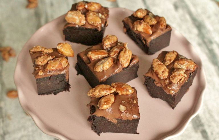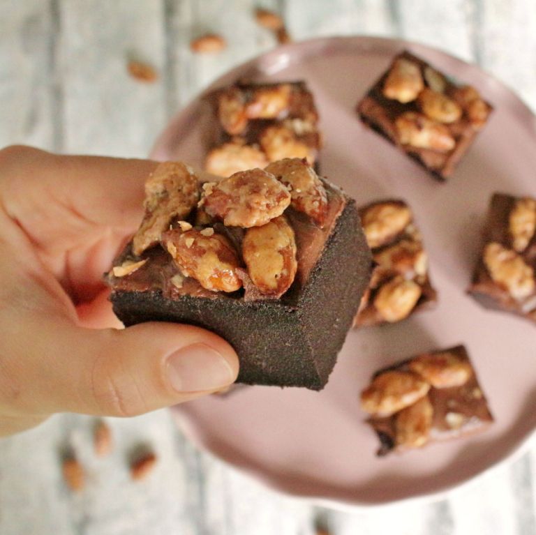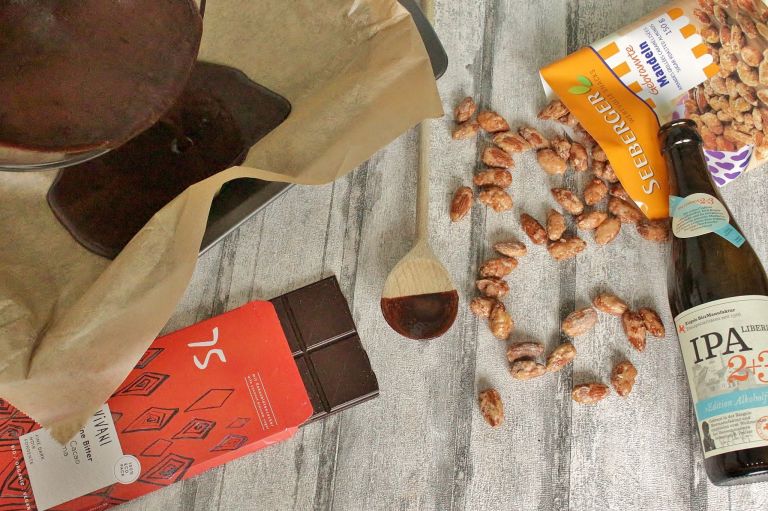Was könnte es schöneres geben als gebrannte Mandeln in der Winterzeit? – Gebrannte Mandeln in der Winterzeit, als Garnitur von saftigen, schokoladigen Brownies! Und bitte verdreht nicht beim „Bier“ die Augen. Denn ähnlich wie bei meinem →Guiness-Schokokuchen, schmeckt man auch hier das Bier am Ende kaum heraus. Aber es gibt viel Feuchtigkeit, macht die Brownies saftig und verleiht ihnen in Kombination mit der dunklen Schokolade einen köstlich-herben Geschmack. Was für eine hervorragende Idee. Und damit will ich mir gar nicht selbst auf die Schulter klopfen, denn die Inspiration dazu kam per Post zu mir.