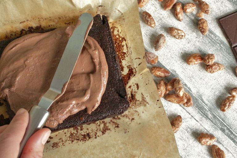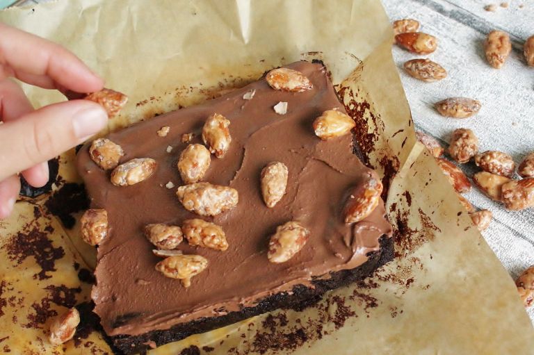 6.) Ist der Kuchen fertig, löst ihn aus der Form und lasst ihn auskühlen. Dann mit der Schokocreme aus Schritt 1 bestreichen. Gebrannte Mandeln nach beliebten im Ganzen oder etwas klein gehackt darauf verteilen.