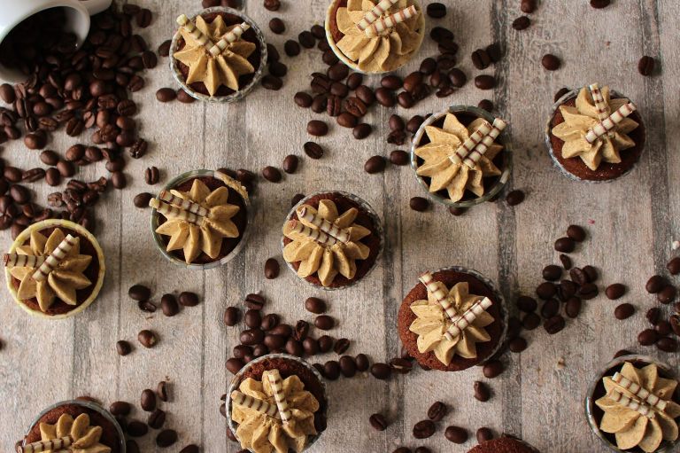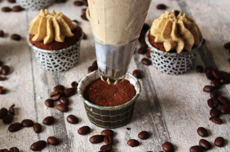 4.) Die Cupcakes sind fertig gebacken, wenn ein Zahnstocher mit saftigen Krümeln, aber nicht mehr mit rohem Teig aus dem Muffin kommt. Lasst sie dann komplett auskühlen und dekoriert sie z.B. mit Kaffee-Buttercreme oder ganz simpel mit Puderzucker. Lasst es euch schmecken!
