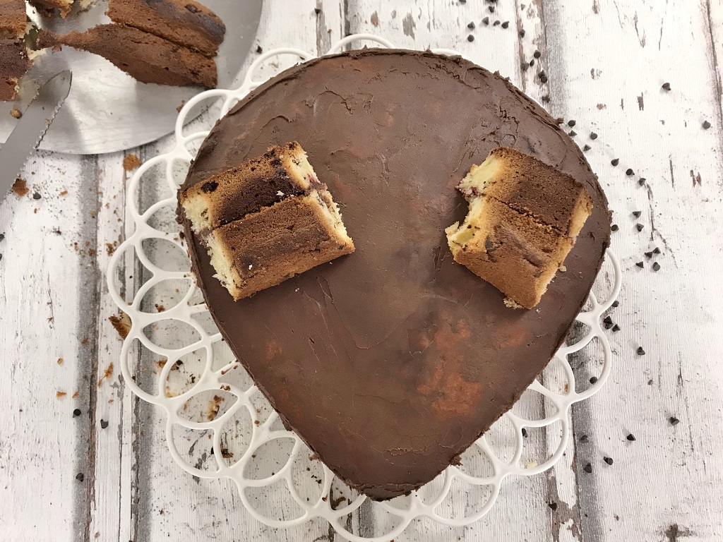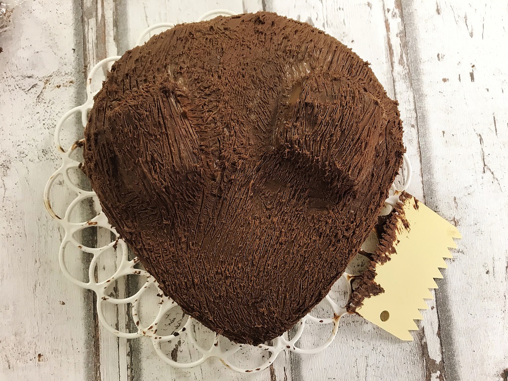 7.) An den Seiten des Kuchens jeweils eine schmale „Sichel“ abtrennen, um der runden Form eine Tropfen-Form zu machen (siehe Foto). Aus den Sicheln könnt ihr zwei kleine Ohren schneiden und mit etwas Schokoladencreme oder Marmelade auf den Kuchen kleben – sie halten die Schoko-Ohren am Platz. Den kompletten Kuchen mit der ganzen Ganache einmal einstreichen und ihn ca. 30 Minuten kalt stellen.