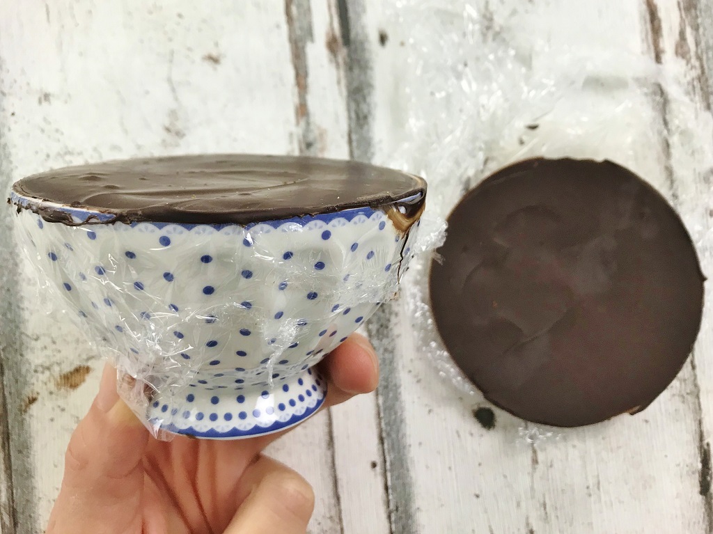 4.) Für die runden Schoko-Ohren schmelzt 40 g Schokolade im Wasserbad. Spannt Frischhaltefolie über zwei Tassen, deren Öffnung die gewünschte Größe der Ohren haben (bei mir waren es ca. Ø 8 cm). Dehnt die Frischhaltefolie durch leichtes Drücken mit der Handfläche aus, damit sie nicht zu stark spannt und sich eine Kuhle bildet. Die geschmolzene Schokolade ein wenig abkühlen lassen und dann mit einem Löffel großzügig auf der mit Frischhaltefolie bespannten Fläche verteilen. Auskühlen lassen und später von der Folie lösen.
