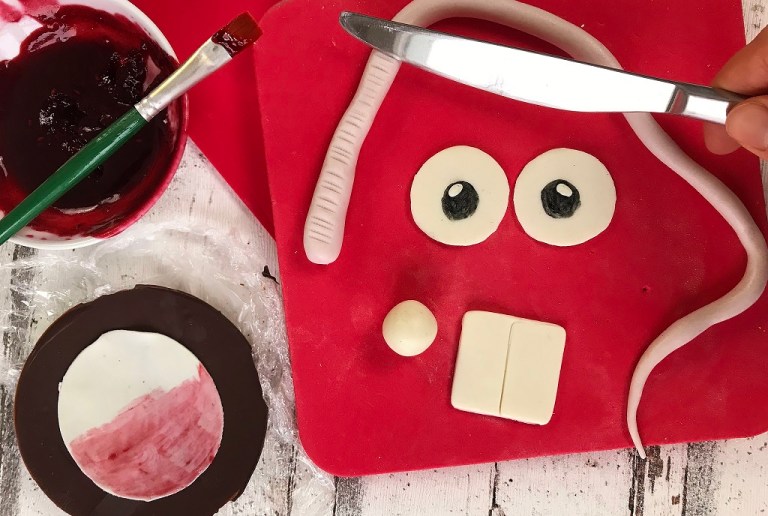 5.) Das weiße Marzipan (ca. 40 g) dünn ausrollen. Zwei kleine Kreise für die Augen (ca. Ø 3 cm) ausstechen und 2 große Kreise, für die hellen Innenseiten der Schokoladenohren (ca. 1 cm kleiner als die Ohren). Für zwei schöne Ratten-Zähne noch ein Viereck mit angedeuteter Mittellinie ausstechen. Für die Nase brauchen wir einen kleinen Ball, den wir mit einem Zahnstocher ein paar Mal einstechen und mit dem Rest rollen wir einen Rattenschwanz aus, dem wir mit einem Messer ein wenig Struktur verleihen (siehe Foto). Für die dunklen Pupillen der Augen könnt ihr dunkle Lebensmittelfarbe verwenden, oder einfach einen halben Teelöffel der Ganache erwärmen und mit dem Finger auf das Auge auftupfen. Ein Fitzelchen Weiß in der Pupille sieht auch sehr gut aus. Dekoration beiseite legen.