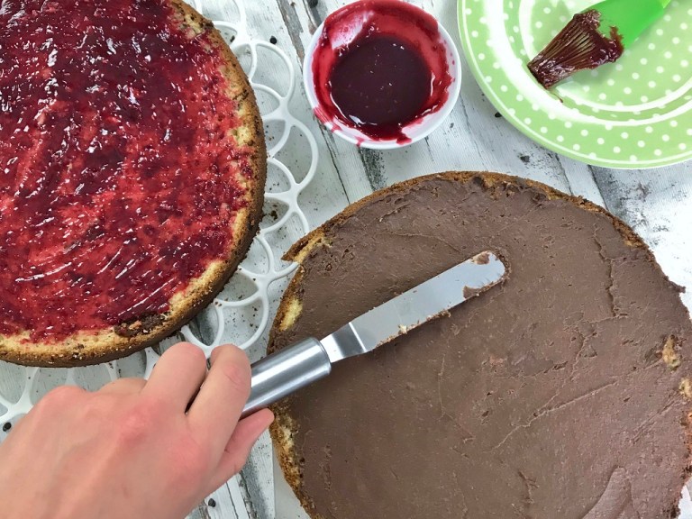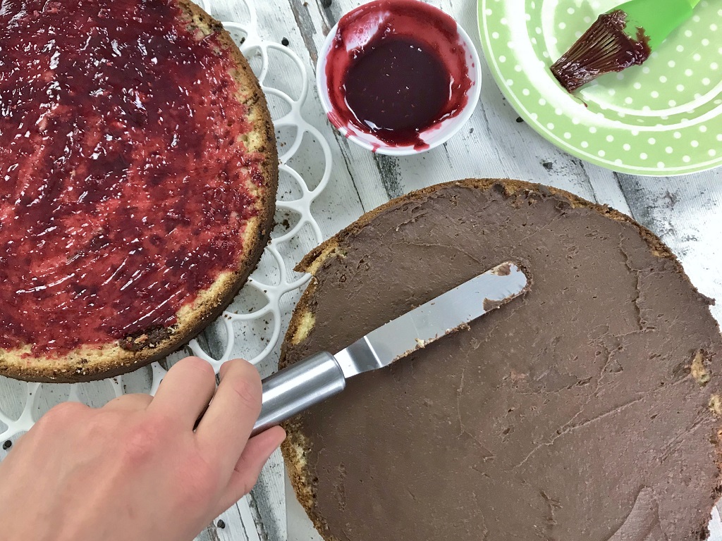 6.) Den gebackenen, erkalteten Kuchen aus der Springform lösen und horizontal durchschneiden. Die aufgeklappten Seiten mit der Schokoaden-Creme und der roten Marmelade (80g) bestreichen. Die Marmelade dafür leicht erhitzen und einen Teelöffel davon zur Seite legen für später. Die beiden Hälften wieder zuklappen.