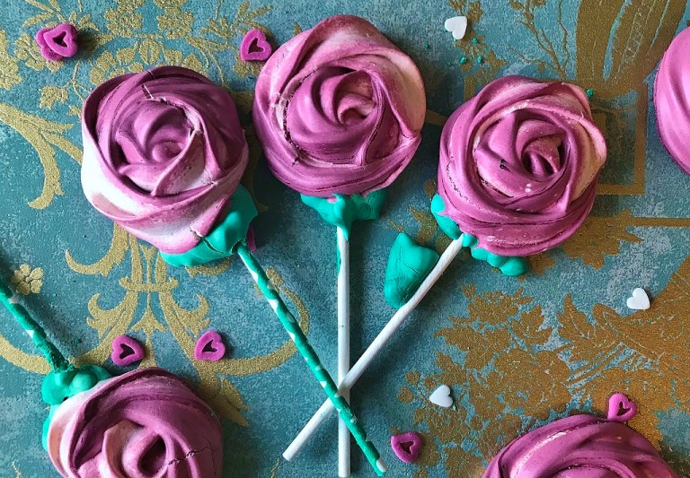 3.) Ein Backblech mit Backpapier auslegen. Die Cake-Pop-Stiele auf das Blech legen und mit ein bisschen Baiser fixieren. Dafür könnt ihr z.B. die Reste aus den Schüssel nehmen. Es hilft dabei, dass die Cake-Popstiele nicht verrutschen und nach dem Backen sieht man den Stiel dann nicht auf der Rückseite durch. Jetzt mit der roten Masse jeweils in einer fließenden Kreisbewegung von innen nach außen eine Rose in Kreisform aufspritzen. Mit etwas Grün (Blätter) garnieren.