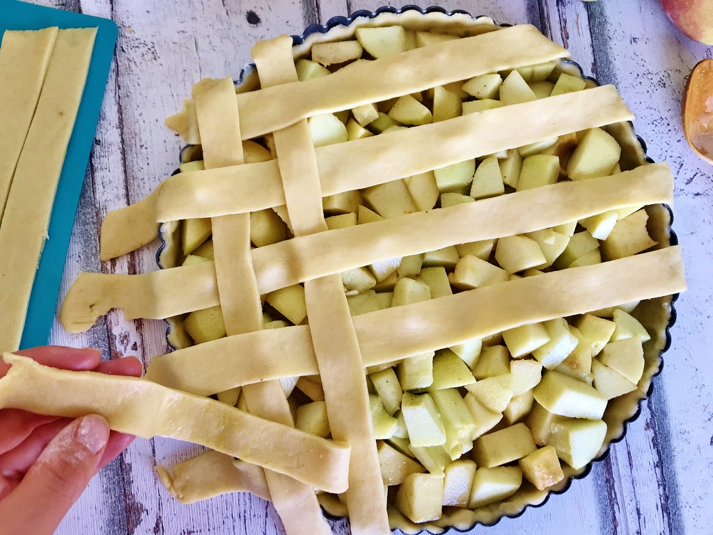 3.) Den Teig für den Bogen auf einer bemehlten Oberfläche ausrollen und in die Tarteform drücken. Mit einer Gabel ein paar mal den Boden durchstechen. Dann die Apfelmischung oben drauf geben und gut verteilen. Mit dem übrigen Teig den Kuchen bedecken. Dafür kann man beispielsweise mit Keks-Ausstechern arbeiten, oder auch (wie hier) den Teig in Streifen schneiden und über die Äpfel flechten.