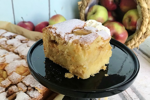 5.) Den Kuchen gut abkühlen lassen und mit Puderzucker bestäuben. Die feuchte Füllung saugt den Puderzucker auf – er bleibt nur auf dem Teig liegen und so erkennt man schön das Muster. Guten Appetit!