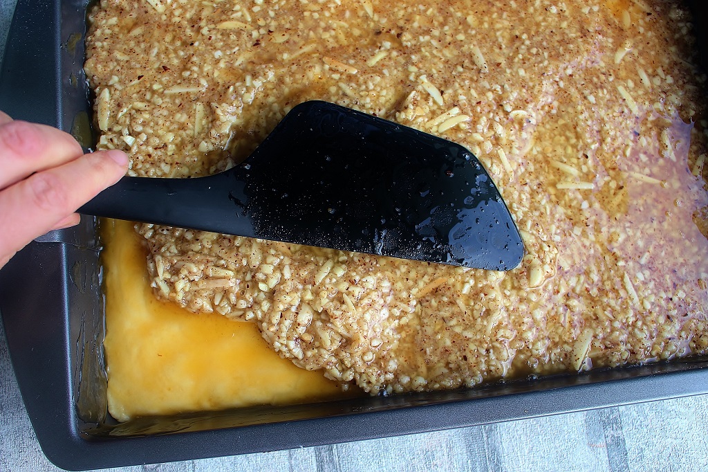 3.) Die Aprikosenmarmelade (2-3 EL) auf dem Teig der Auflaufform verstreichen. Das klappt besonders gut, wenn man sie leicht erwärmt, z.B. einige Sekunden in der Mikrowelle. Danach die Nussmasse auf den Teig geben und mit einem Spachtel oder Löffel gleichmäßig andrücken, sodass das ganze Blech gleichmäßig bedeckt ist. Die Auflaufform auf mittlerer Einschubebene im Ofen etwa 22-25 Minuten backen.