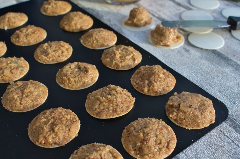 3.) Die Backobladen (ca. 30) mit je einem Esslöffel der Masse bedecken und mit einem feuchten Messer zu einer glatten Kuppen streichen. Auf ein mit Backpapier ausgelegtes Backblech geben. Die Plätzchen gehen ein wenig auf, lasst also etwas Platz. Im vorgeheizten Backofen auf mittlerer Ebene ca. 22-25 Minuten backen.