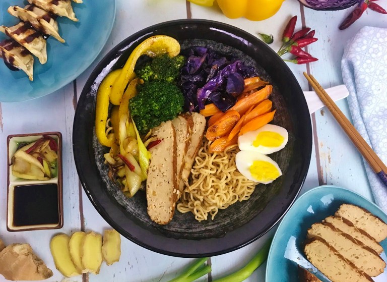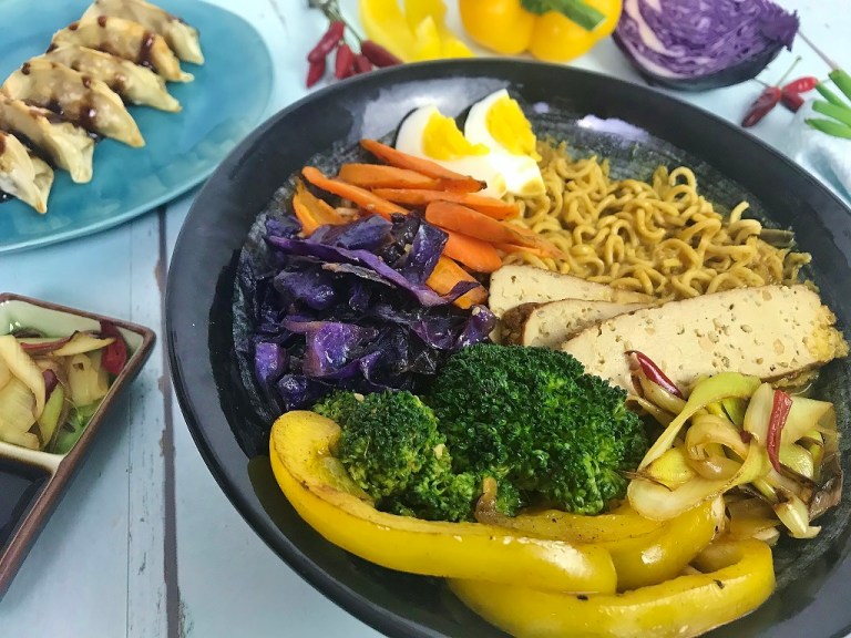 Dieses Ramen-Rezept ist vegan, solange du das Ei weglässt und bei der Zugabe der Soßen darauf achtest, dass sie keine tierische Zusätze enthalten (was sie von Natur aus eigentlich nicht tun sollten).