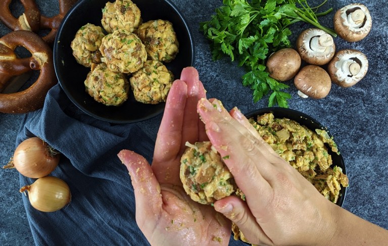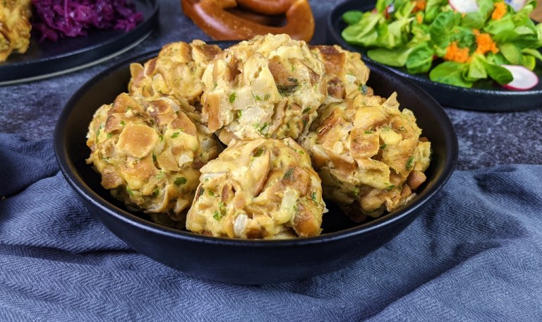 Semmelknödel sind bei uns etwas für besondere Anlässe – beim Weihnachtsessen zum Beispiel. Mein Mitbewohner und ich haben in den letzten Jahren am Vorweihnachtsabend immer zusammen in der Küche gestanden und zusammen Rotkraut, Soßen, vegetarische Sellerieschnitzel und wunderbare Semmelknödel aus Laugenbrezeln selbst gemacht. Semmelknödel werden aus Brezeln vom Vortag gemacht und sind somit auch eine leckere Resteverwertung, beispielsweise wenn vom Kindergeburtstag noch zu viele Brezeln übrig sind. Probiert die Brezelknödel unbedingt mal aus!