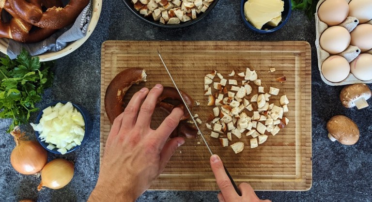 Gut zu wissen: Die Brezeln lassen sich frisch besser schneiden, da sie noch nicht hart geworden sind. Falls es zeitlich passt, schneidet die Brezeln klein und lasst sie danach für den nächsten Tag stehen.