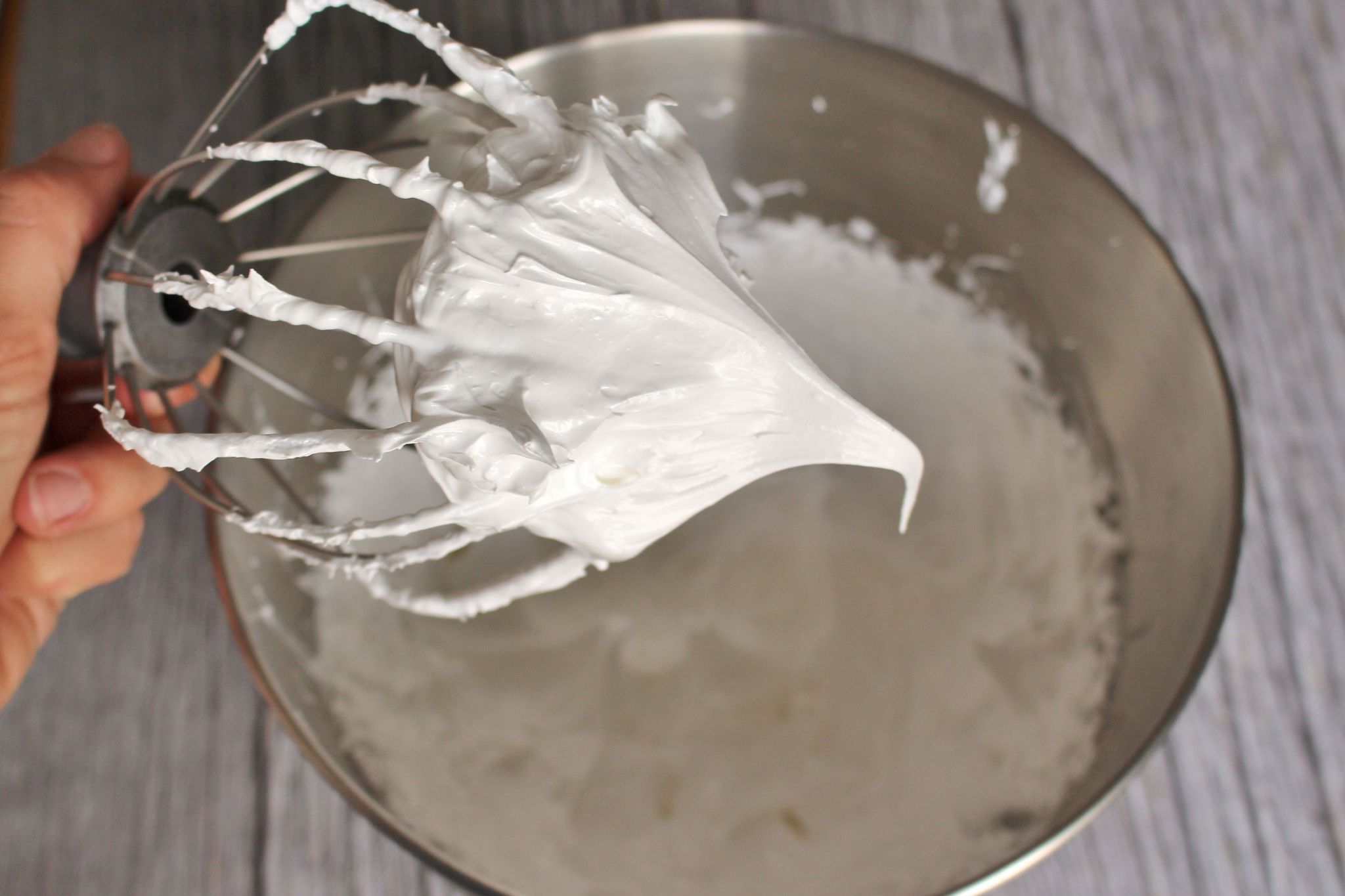 Weich und zart ist die Swiss Meringue Buttercreme. Eiweiß und Zucker werden unter ständigen Rühren mit dem Handmixer über einem Wasserbad aufgeschlagen. Nach ein paar Minuten bilden sich glänzende Spitzen und dann wird die Creme nochmal im Standmixer geschlagen, bis sie erkaltet. Später kommt die Butter dazu. Das Ergebnis ist eine samtweiche, aromatische Creme. Sie ist als Basis für Fondant gut geeignet. → Um diese Creme dreht es sich in diesem Rezept.