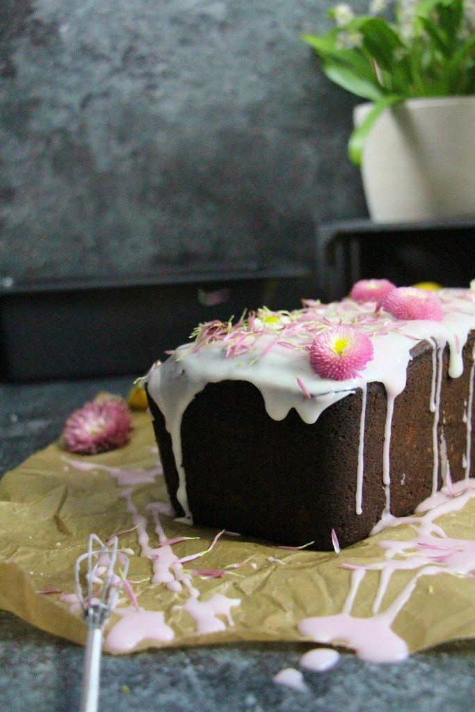 6.) Für den Zuckerguss den Puderzucker (100g) mit dem übrigen Saft der Zitrone glatt rühren – Achtung, ggf. brauchst du auch nicht den ganzen Saft, da Zitronen unterschiedlich groß und saftig sind. Besser erst mal mit weniger arbeiten, damit der Guss nicht zu flüssig wird. Sollte es nicht reichen, kann man immer noch mit etwas Wasser nachhelfen. Übrigens: Wenn du den Saft leicht erwärmst, löst sich der Zucker besonders gut. Mit essbaren Blüten* dekorieren.