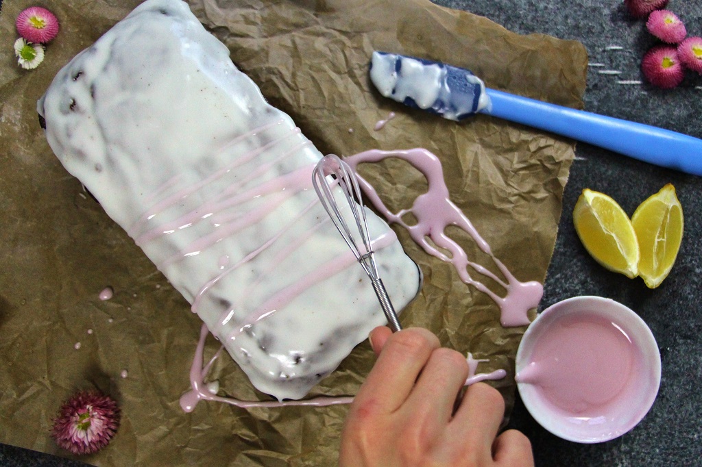 6.) Für den Zuckerguss den Puderzucker (100g) mit dem übrigen Saft der Zitrone glatt rühren – Achtung, ggf. brauchst du auch nicht den ganzen Saft, da Zitronen unterschiedlich groß und saftig sind. Besser erst mal mit weniger arbeiten, damit der Guss nicht zu flüssig wird. Sollte es nicht reichen, kann man immer noch mit etwas Wasser nachhelfen. Übrigens: Wenn du den Saft leicht erwärmst, löst sich der Zucker besonders gut. Mit essbaren Blüten* dekorieren.