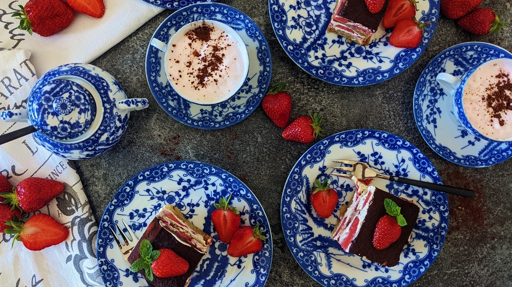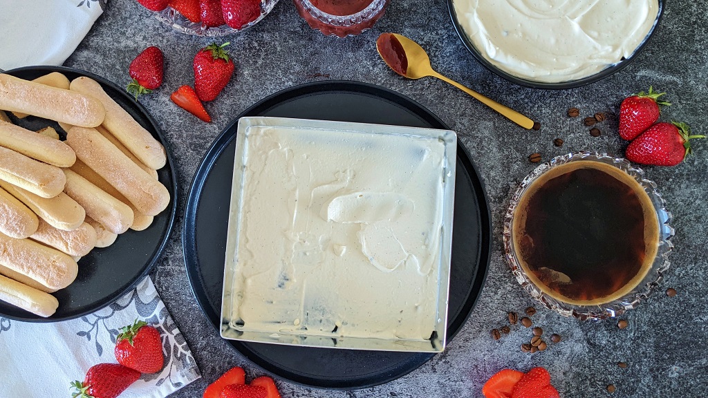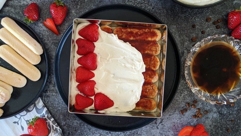 Endlich ist die Erdbeerzeit wieder da und mit ihr die hunderten wundervoll fruchtigen Rezeptvariationen! Heute teile ich ein etwas abgewandeltes Tiramisu mit euch, das durch ein leckeres Erdbeeraroma und frischen Joghurt besticht. Dadurch ist es nicht so schwer wie das klassische Tiramisu – perfekt als Sommerdessert, oder als Nachtisch zum Grillen. Am besten wird es, wenn ihr es am Vortag vorbereitet, dann kann das Löffelbiskuit noch mal so richtig durchziehen. Wer es gerne mag, kann in den Kaffee auch noch einen Schoss Amaretto rein machen – da bei uns meistens Kinder mitessen, lass ich ihn jedoch weg. Ich verwende gerne einen quadratischen Backrahmen für das Tiramisu, wer sowas nicht hat, kann aber natürlich auch einfach eine Auflaufform nehmen.