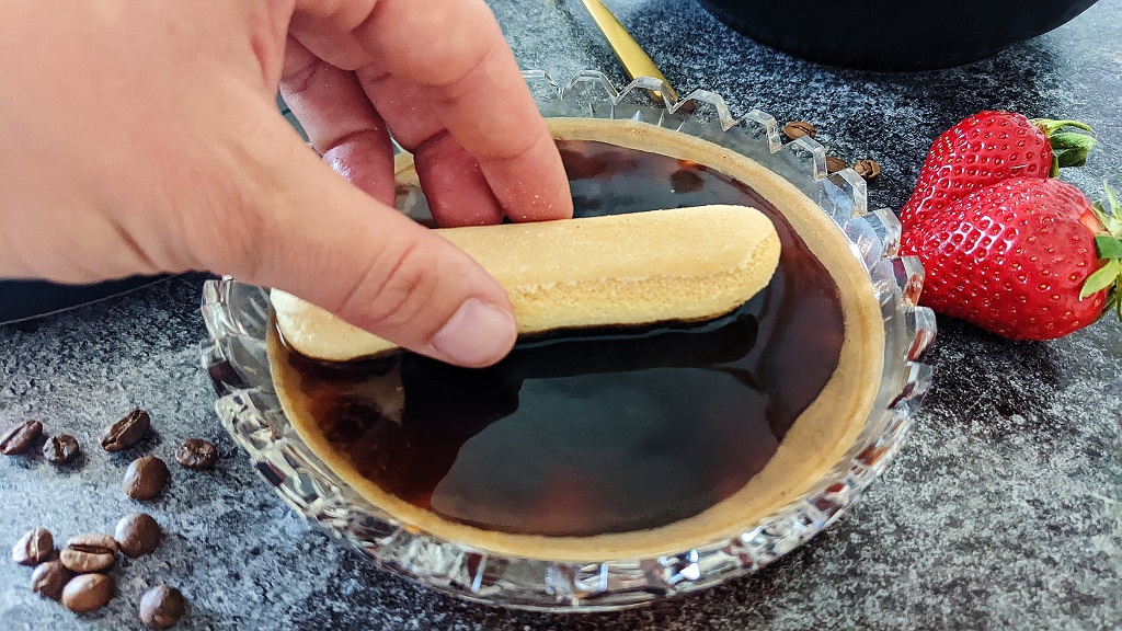 4.) Die Hälfte der Löffelbiskuit (insgesamt ca. 20-24 Stück) mit der zuckrigen Seite nach oben für 2-3 Sekunden in den Kaffee tauchen und mit der nassen Seite nach oben eine Schicht in die Auflaufform legen. Die Hälfte der Erdbeermarmelade (insgesamt 4 EL) auf den Löffelbiskuit verteilen. Eine weitere dünne Cremeschicht auftragen und komplett mit Erdbeer-Hälften belegen.