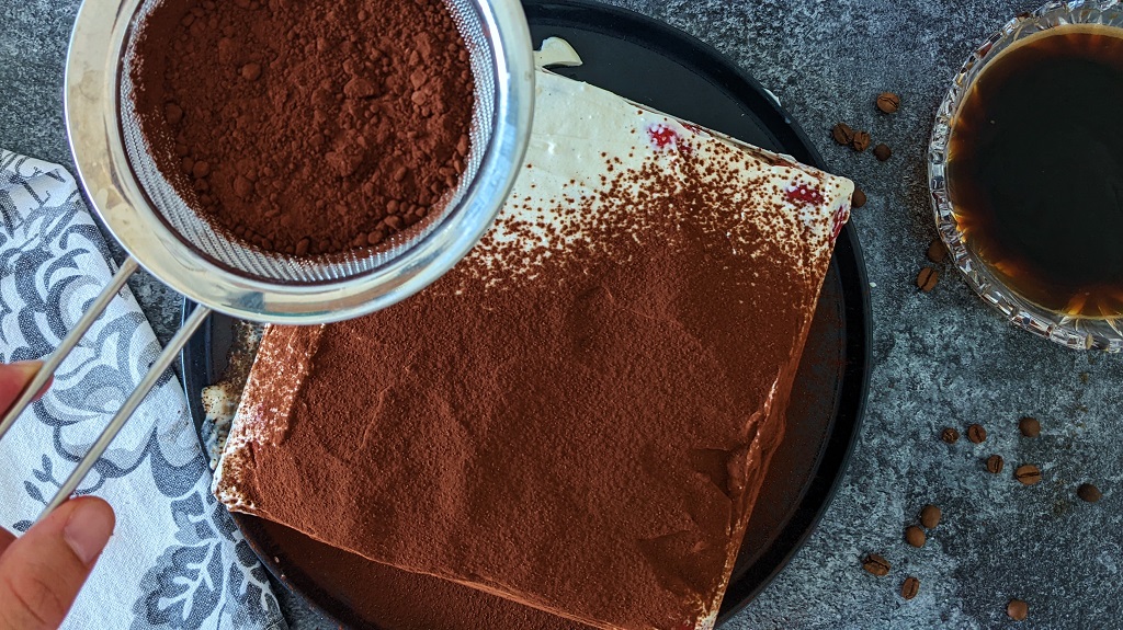 3.) Die Mascarpone (500g) mit dem Joghurt (500g) vermischen. Den Puderzucker (5 EL) sieben und gemeinsam mit der Vanille unterrühren. Eine Auflaufform oder einen Backrahmen (ca. 18 x 18 cm) dünn mit der Creme bestreichen.