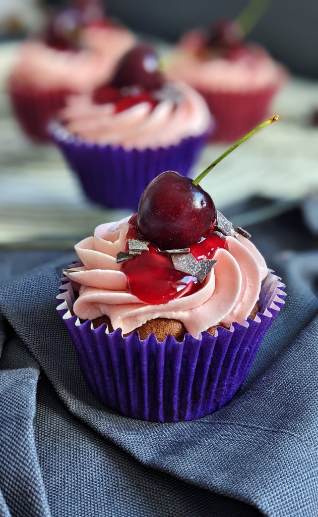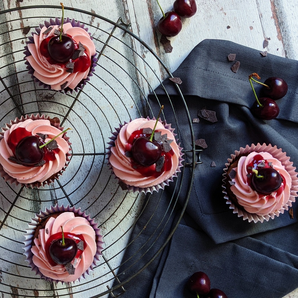 6.) Bei Bedarf die Farbe der Creme mit einem Hauch roter Lebensmittelfarbe intensivieren. Die Creme in einen Spritzbeutel* mit Tülle nach Wahl geben (z.B. offene Sterntülle*) und auf die Cupcakes verteilen. Die übrige Kirschmarmelade (2 EL) leicht erwärmen und dekorativ auf der Creme verteilen. Dafür darf sie ein wenig warm sein, aber bitte nicht heiß. Die Cupcakes noch mit Kirschen und den Schoko-Streuseln (1 EL) aus Schritt 3 dekorieren.