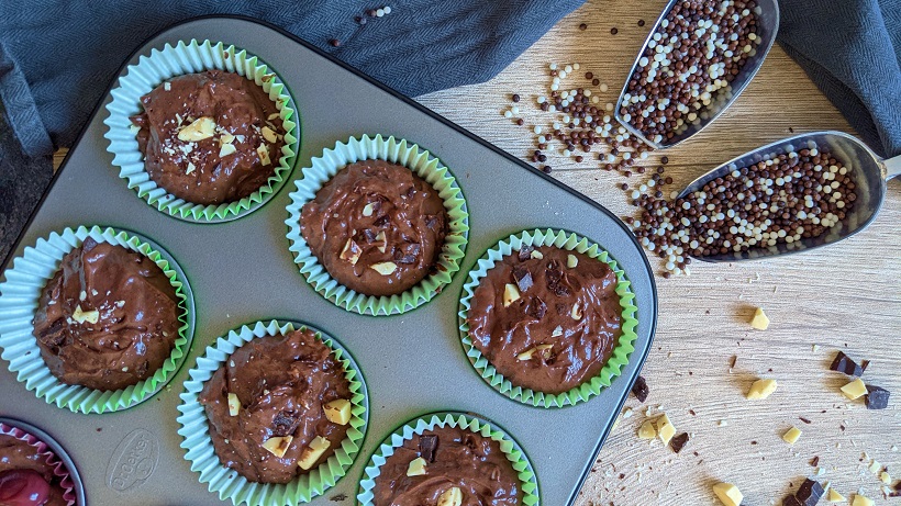 3.) In einer zweiten Schüssel Mehl (180g), Backpulver (1 TL) und Backkakao (30g) sieben und trocken gut vermischen, damit der Teig gleichmäßig aufgeht und keine Kakaoklumpen entstehen. Die Schokolade (je 80g Zartbitter und weiß) in kleine Stücke hacken. Dabei 2-3 El besonders feine Stücke oder Krümel für die Dekoration beiseite legen. Die trockene Mehl-Mischung unter die feuchten Zutaten rühren, bis eine gebundene Masse entsteht. Dabei schlückchenweise die Milch (140g) und schließlich die gehackte Schokolade dazu geben.