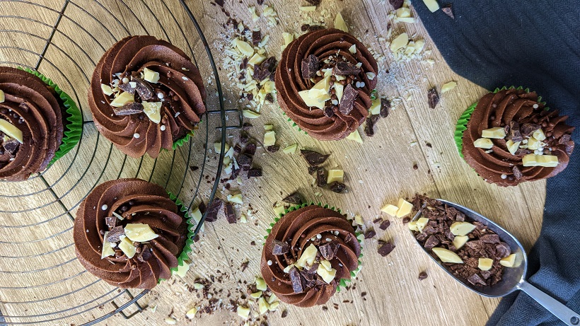 Schoko-Junkies kommen heute so richtig auf ihre Kosten! Ich teile heute mein Rezept für herrlich schokoladige Cupcakes mit euch, in denen sowohl dunkle als auch weiße Schokolade drin ist. Obendrauf gibt es eine fantastische Schoko-Frischkäse Creme mit Mascarpone, die einfach nachzumachen ist und dabei schön frisch schmeckt. Normalerweise bin ich ja kein Freund von weißer Schokolade, da sie sehr süß ist – in diesen sonst recht herben Cupcakes bringt sie aber genau den richtigen Kick. Wie immer bei Cupcakes habe ich den Zucker in den Küchlein reduziert, da die Creme obendrauf bereits süß ist.