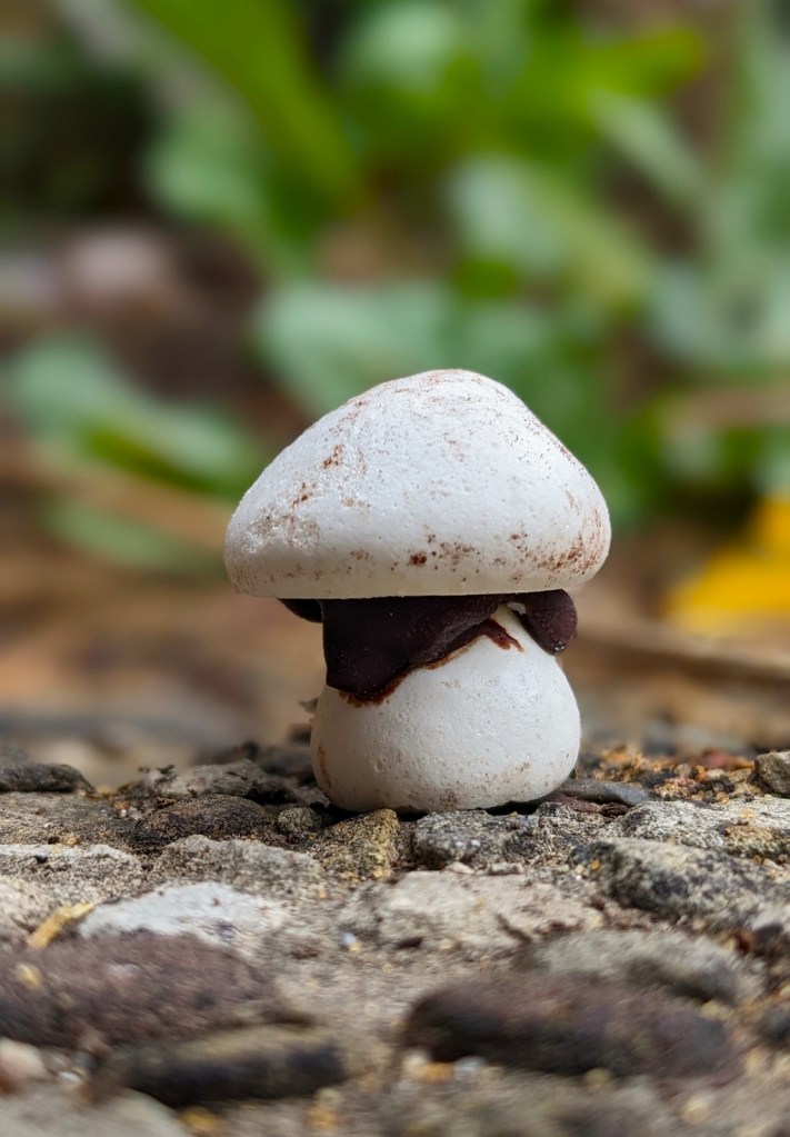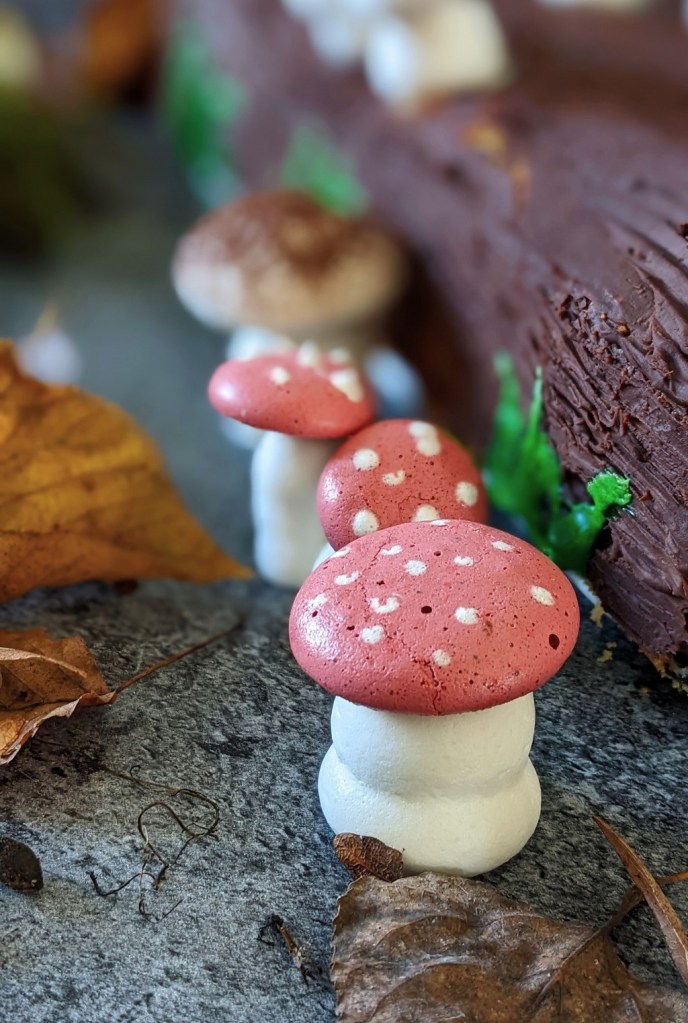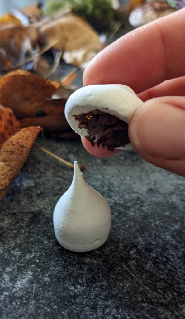Vorsicht: Wenn ihr die Pilze als Dekoration für einen Kuchen macht, achtet darauf sie erst kurz vor dem Servieren anzubringen. Das Baiser zieht andernfalls Feuchtigkeit und löst sich auf.
