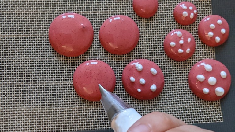 4.) Die Masse in einen Spritzbeutel* mit Lochtülle* geben. Im Paar immer sowohl kleine Kreis aufspritzen (Pilzkappen), als auch hohe Baiser-Küsse (Pilzstiel) – beides sollte mindestens eine Standfläche in der Größe eines 5-Cent Stücks bis maximal so groß wie ein 1-Euro-Stück haben. Dafür benötigt man ggf. ein wenig Übung. Mein Tipp: Beim Aufspritzen der Pilzstiele die Spritztülle langsam nach oben ziehen, um eine Art Turm zu bekommen. Für Fliegenpilze einen kleinen Teil der Creme für die Pilzkappen mit Lebensmittelfarbe rot* einfärben. Mit einem Zahnstocher oder einer sehr kleinen Lochtülle* die weißen Flecken auf die Kappen tupfen.