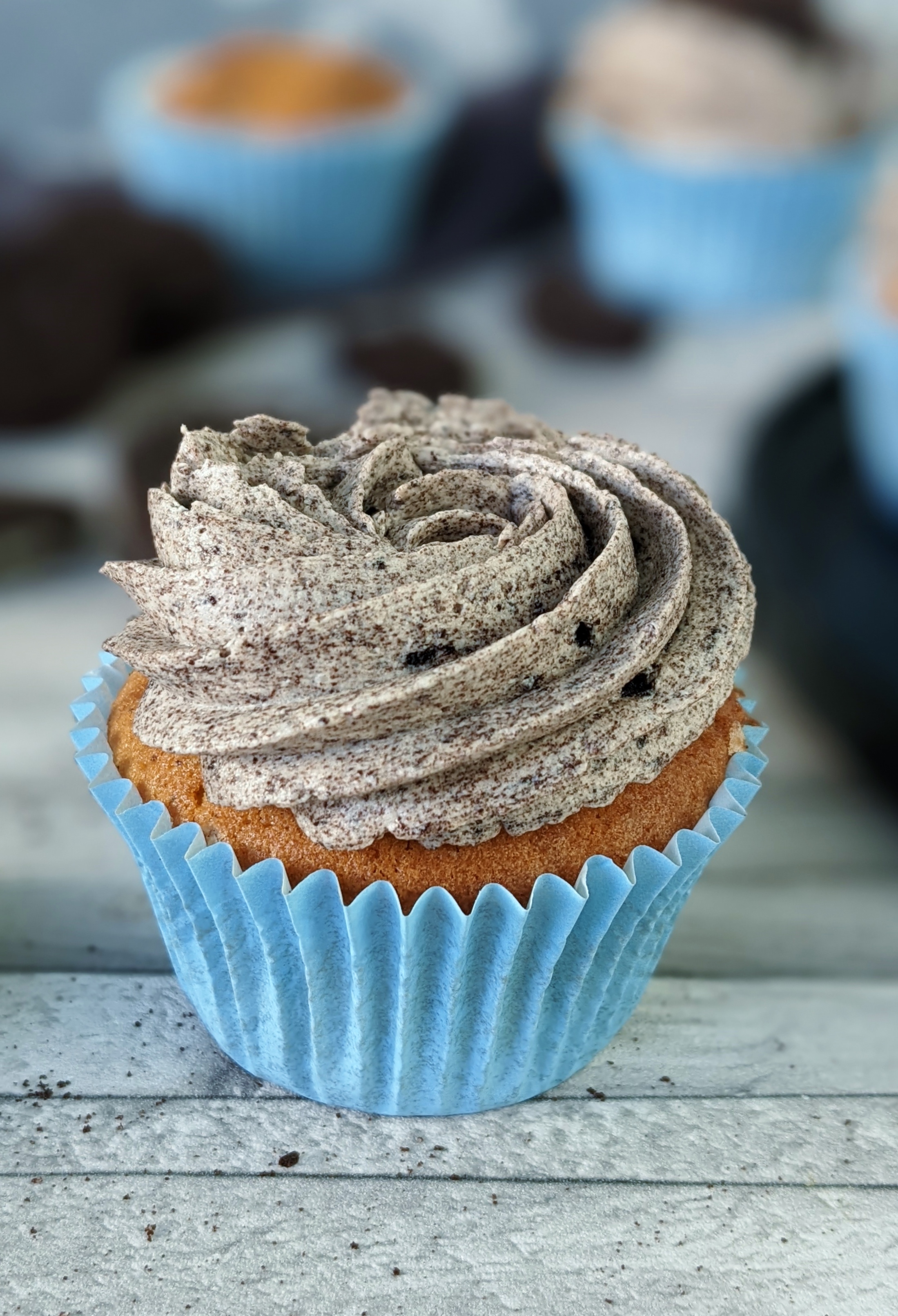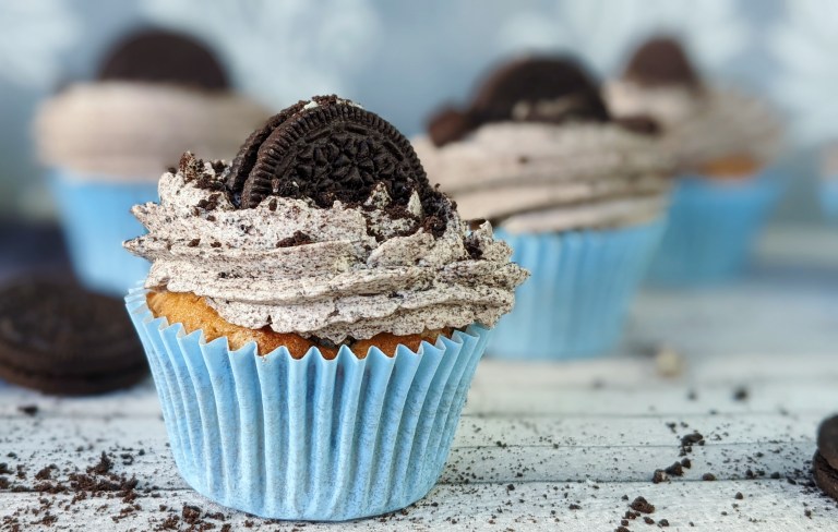 Tipp: Falls ihr die Cupcakes für den nächsten Tag macht, setzt die Deko-Hälfte erst kurz vor dem Servieren oben drauf. Die Kekse obendrauf ziehen sonst über Nacht Feuchtigkeit und werden weich.