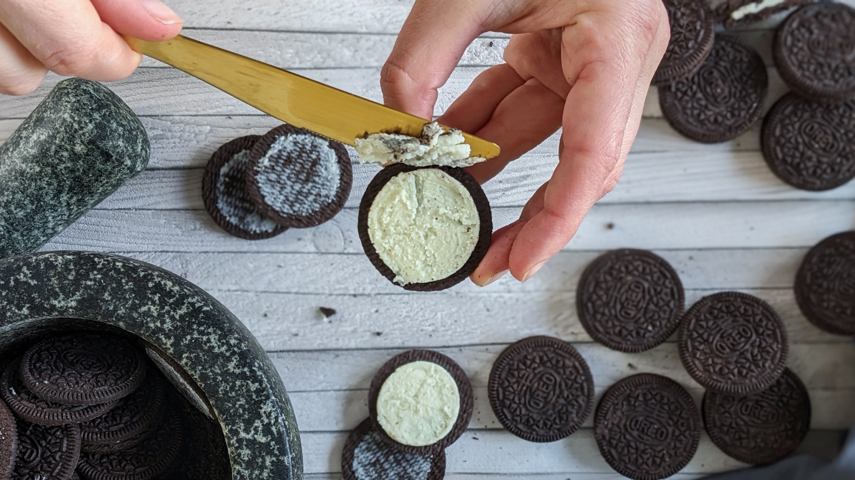 5.) Für die Creme sechs der Oreo-Kekse (6) halbieren und beiseite legen. Die restlichen Oreo-Kekse (10) öffnen und die Creme entfernen. Das geht mit einem Messer gut. Die schwarzen Oreo-Schalen mit einem Mörser* (Alternativ geht auch ein Nudelholz und ein Gefrierbeutel) zu einem sehr feinen Mehl verarbeiten. Wenn hier Klümpchen bleiben, wird euch später beim Dekorieren die Spritztülle verstopfen.