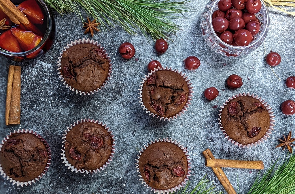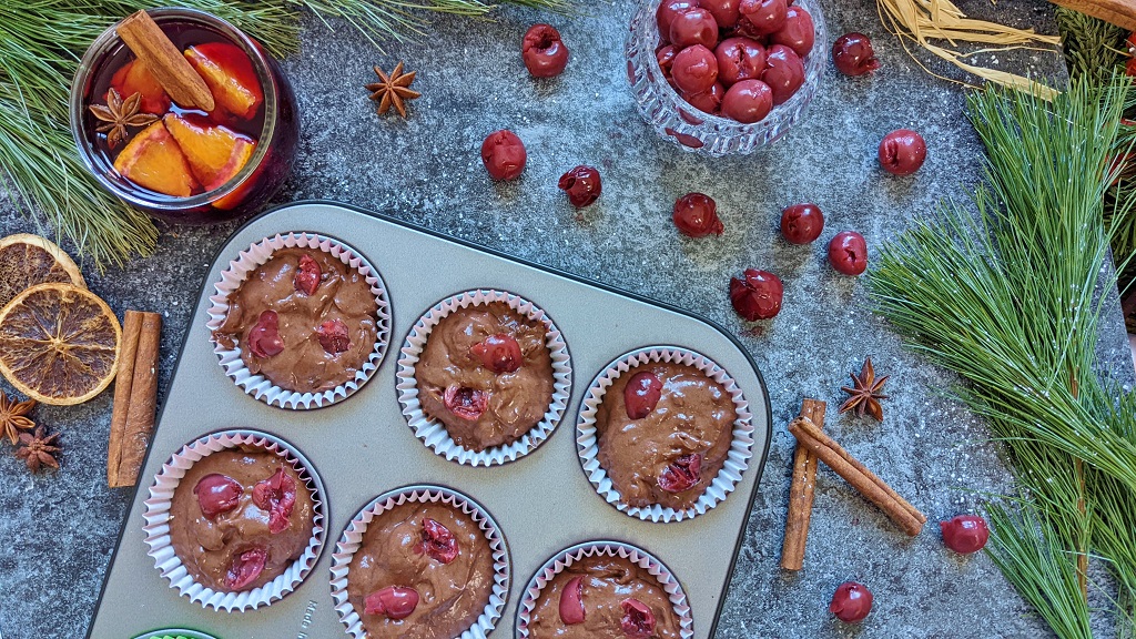 3.) In einer zweiten Schüssel Mehl (180g), Backpulver (1 TL) und Backkakao (30g), Zimt (1/2 TL) sieben und trocken gut vermischen, damit der Teig gleichmäßig aufgeht und keine Kakaoklumpen entstehen. Die trockene Mehl-Mischung unter die feuchten Zutaten rühren, bis eine gebundene Masse entsteht. Dabei schlückchenweise den Glühwein (140g) hinzugeben.