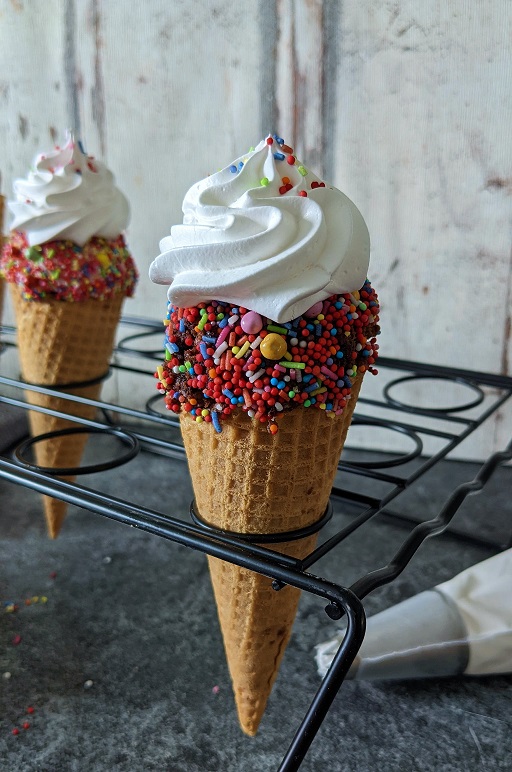 Dieses Eis schmilzt garantiert nicht! Denn diese süßen Eiswaffeln sind in Wirklichkeit gar nicht mit Eis gefüllt, sondern mit Schokolade, Zuckerstreuseln, Kuchen und garniert mit einer leckeren Baiser-Creme. Perfekt als Kuchen für Kindergeburtstage im Sommer! Natürlich könnt ihr auch eine andere Creme verwenden, jedoch ist diese Creme ideal für heiße Temperaturen im Sommer, da sie nicht in der Hitze schmilzt. Für das „Eisbällchen“ verwenden wir eine Masse aus Creme und Kuchenkrümeln.