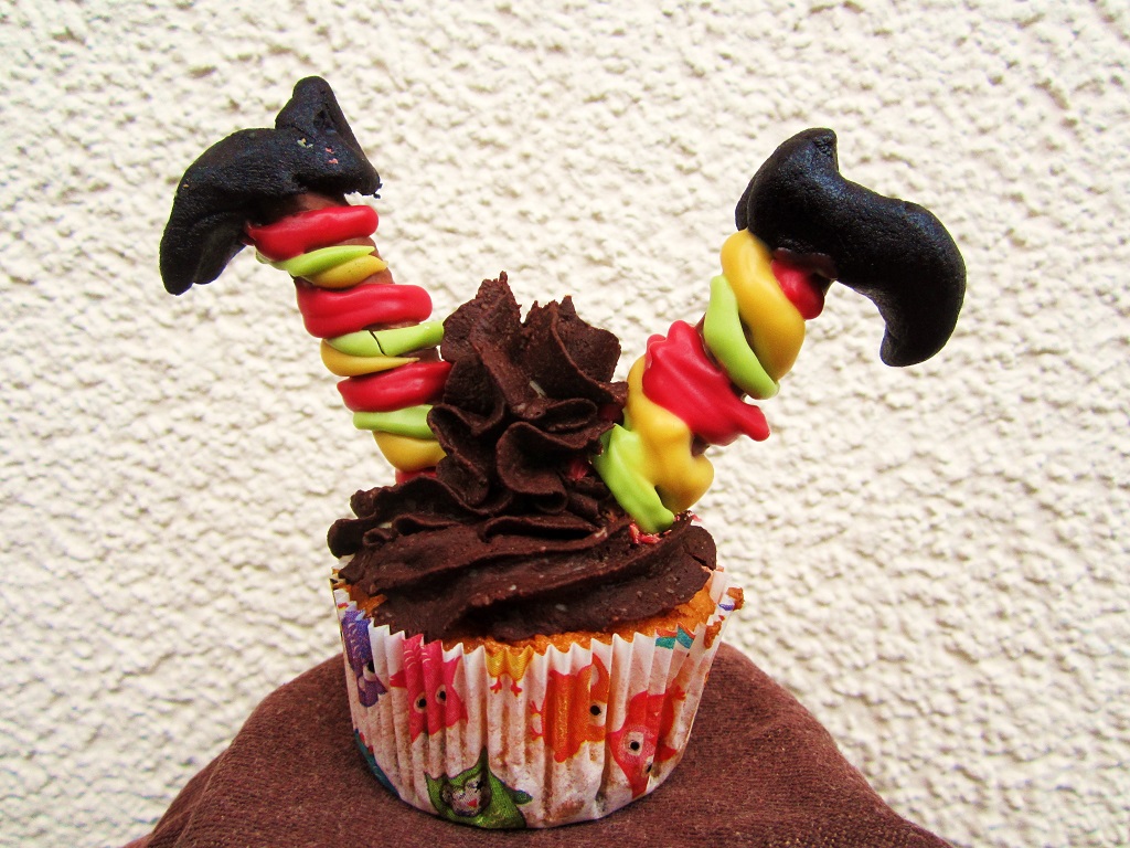 Nichtsahnend bin ich also am Backen von Chocolate-Chip Cupcakes mit Schokoladenganache, als plötzlich eine handgroße Hexe in der Küche rumspringt. Ich renne also ins Wohnzimmer, um eine Kamera zu holen (sonst glaubt einem das ja keiner) und als ich wieder kam, hab ich nur noch die Füße gesehen, die aus dem Cupcake steckten. Fand das ein bisschen frech. Weitere Ideen für Kuchen rund um Halloween sind zum Beispiel die Spinnennetz-Cupcakes, Kürbiscupcakes, Marzipan Kürbisse, die Fledermaus-Cupcakes und die fetten Kellerspinnen.